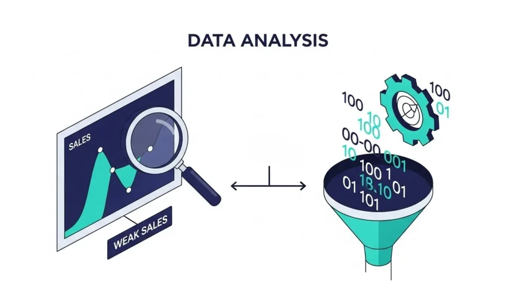 المشكلة الكبرى التي نراها يومياً هي أن أصحاب المتاجر ينظرون إلى الرقم النهائي فقط (عدد الطلبات). لكن حل ضعف المبيعات في المتجر الإلكتروني الحقيقي يبدأ من النظر لما وراء الستار. نحن نبدأ دائماً بتحليل “نقاط التسرب” (Drop-off Points) باستخدام أدوات مثل GA4 و Hotjar.
