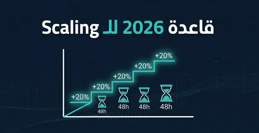 قاعدة 2026 للـ Scaling: “قم بزيادة الميزانية بنسبة 20% فقط كل 48 إلى 72 ساعة، بشرط استمرار ثبات الـ ROAS.”